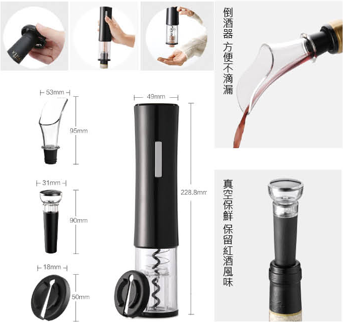 添右企業有限公司 - 08N-KT45 自動紅酒開瓶器禮盒組 紅酒電動開瓶器 紅酒開瓶器 電動開瓶器 自動開瓶器 紅酒開瓶 優選酒具組合 自動開瓶、超長續航 花瓣型倒酒器 抽真空紅酒塞 可客製印刷 logo 文字,宣傳效果十足 需依照數量報價,歡迎來電洽詢 我們將盡快為您服務,期待您的佳音 產品內容:自動開瓶器 x1 、割錫紙刀 x1 真空保鮮酒塞 x1 、花瓣倒酒器 x1 、說明書 x1 材質 : ABS 、 PC 、合金螺旋勾 適用瓶口 : ≦ 35mm 的直口瓶和凸口瓶 供電源: 4號電池x4(不含)