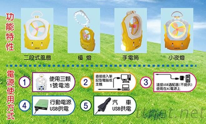 功能: 二段式風扇、檯燈、手電筒、小夜燈